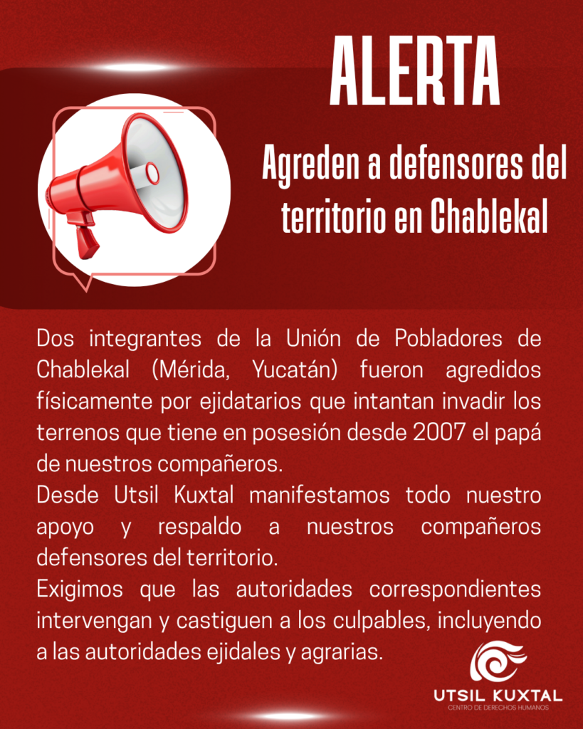Dos integrantes de la Unión de Pobladoras y pobladores por el derecho a la tenencia de la tierra y los recursos naturales de Chablekal fueron agredidos por un ejidatario quien se encontraba invadiendo los terrenos que están desde 2007 bajo posesión legal del papá de nuestros compañeros defensores.